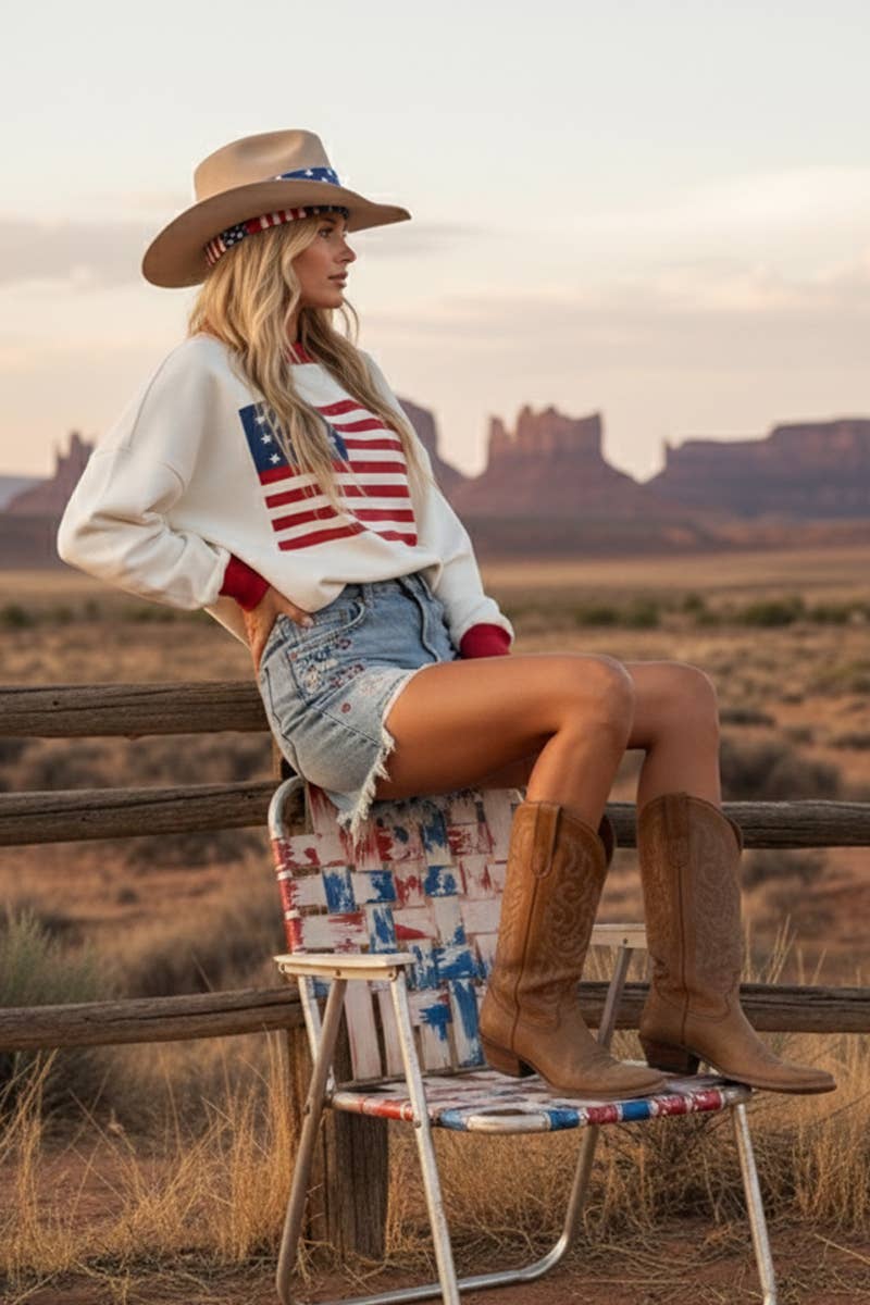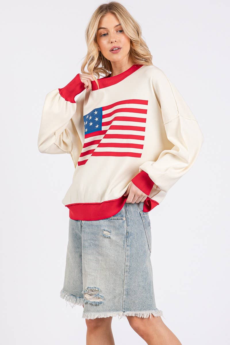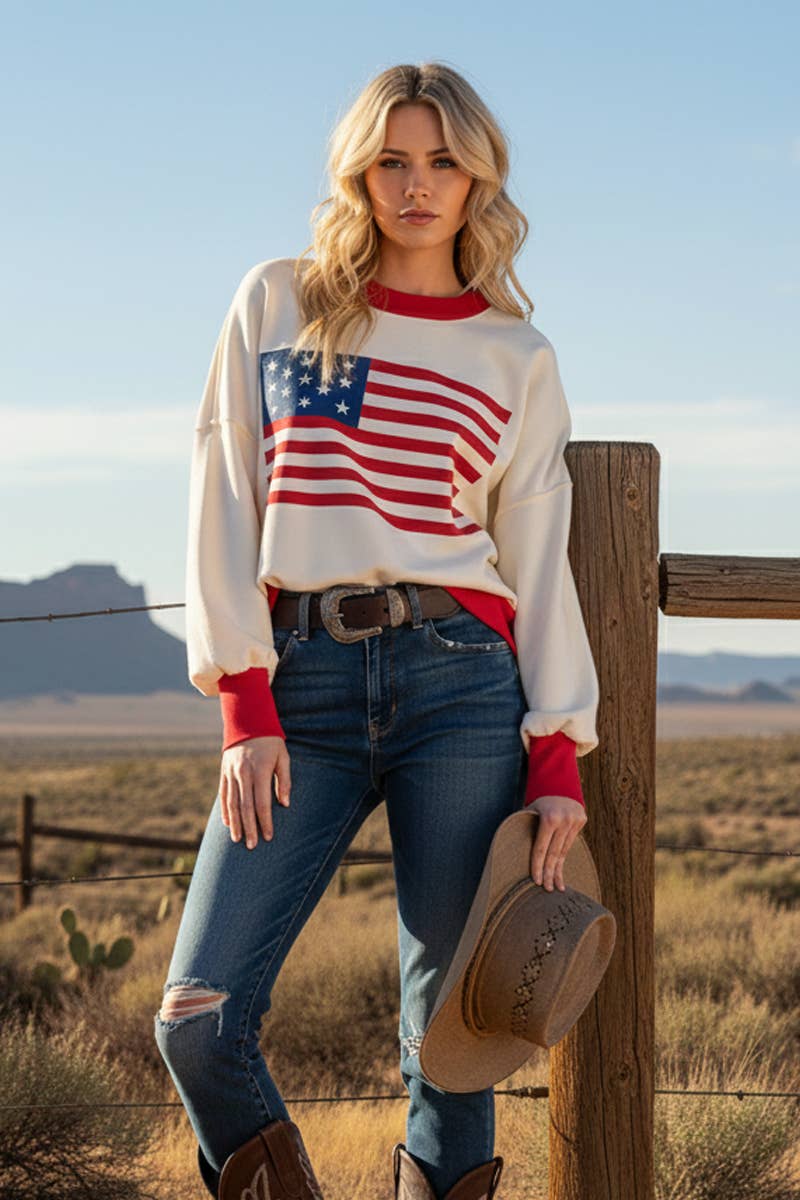 The front displays a simplified flag graphic with white stars on a blue field and red stripes on a white background. The sweater has a relaxed fit, with a vibrant red ribbed neckline, cuffs, and hem that add bold contrast to the white base. The balloon-style sleeves give it a modern and casual look, making it perfect for patriotic occasions, Memorial Day, July Fourth or everyday wear.