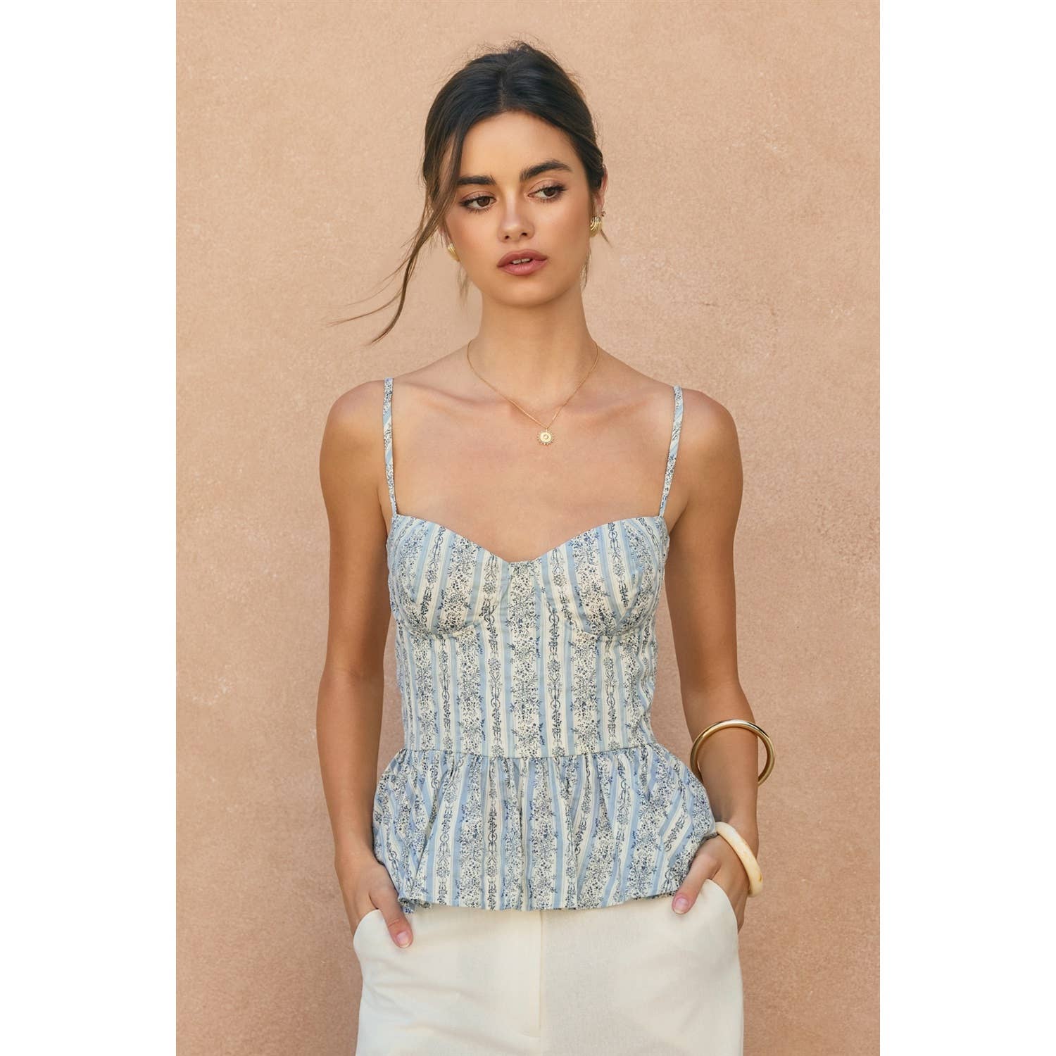 This Brume et Fleur corset top is pure joy—a playful mix of floral and stripe prints on soft, breathable 100% cotton. Structured with gentle boning and supportive underwire cups (no padding needed), it hugs you in all the right ways. Adjustable spaghetti straps with ring and slider give you control, while the smocked back panel and ruffled hem add personality and movement. Invisible side zipper for effortless dressing, fully lined for confidence. A charming, versatile piece that feels as good as it looks.
