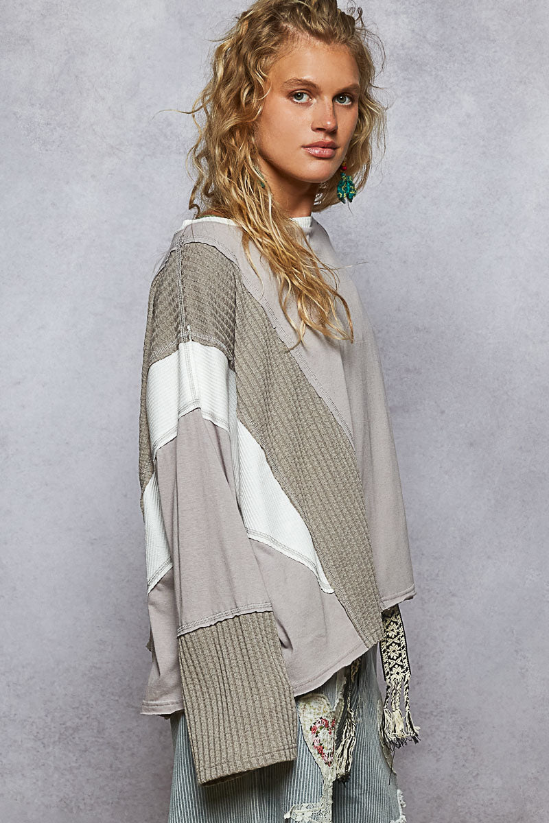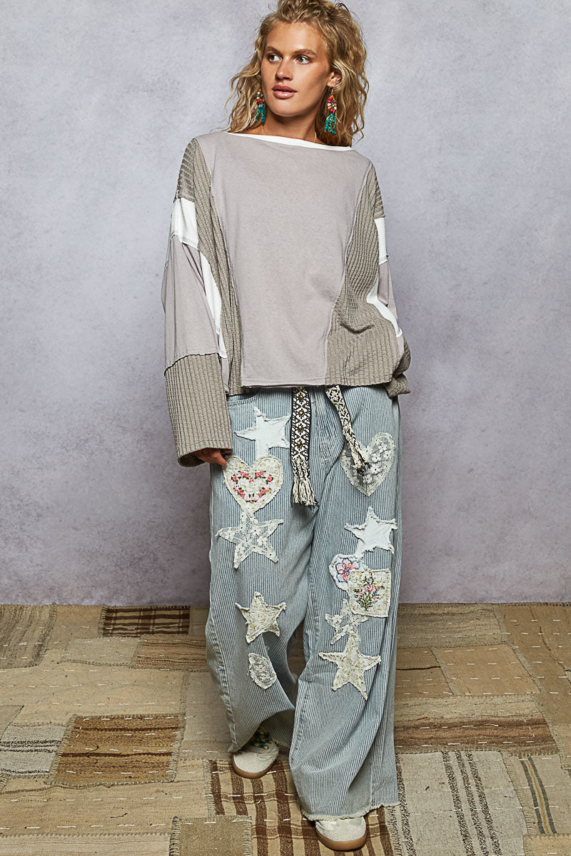 Step into comfort with the Cozy Collage oversized top, blending soft grays and crisp white in a playful mix of fabrics. Its boat neck adds a touch of charm, while the roomy fit invites easy movement and relaxed vibes. Perfect for lounging or layering, this top brings cozy style to your everyday wardrobe.
