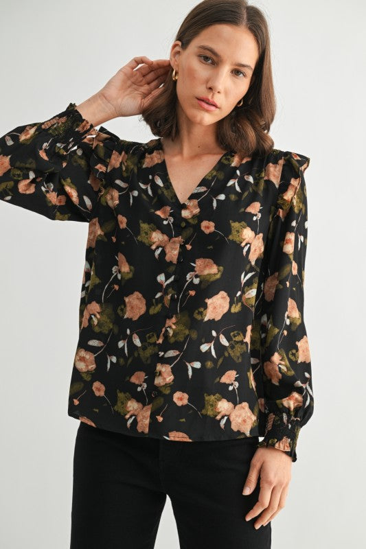 Elevate your wardrobe with this sophisticated floral print blouse featuring elegant smock detailing and a button-front design. The delicate ruffle accents add a refined touch, making it perfect for dressy occasions or polished everyday wear. Its flattering silhouette combines comfort and style for effortless elegance.