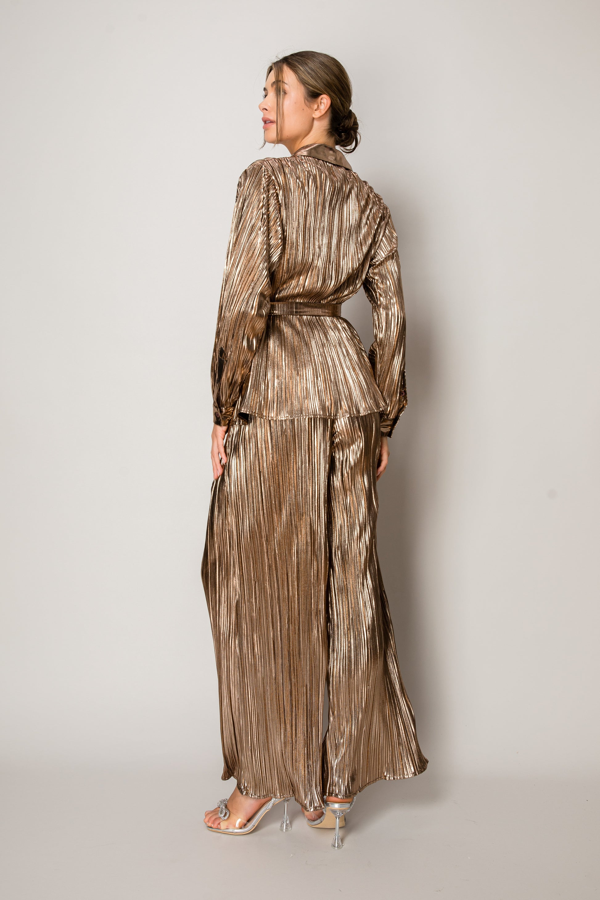 Embrace bold elegance with the Golden Radiance Pants, featuring luxurious gold pleats and a flowing wide-leg design. The elastic gold waistband ensures a comfortable, flattering fit while adding a subtle touch of shimmer. These pants make a fearless style statement, blending sophistication and ease for any occasion where you want to stand out. Matching Blouse Also Available.