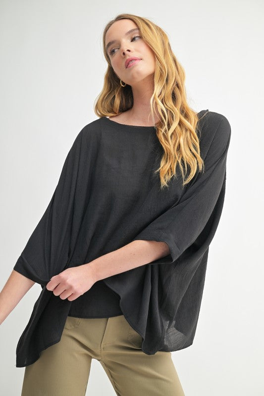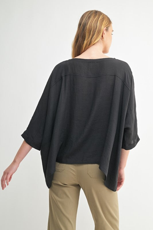 Add a dash of fun to your wardrobe with Raw Elegance. This black top features a scoop neck with trendy raw edge detailing and playful dolman sleeves that offer roomy comfort and style. Perfect for effortless days when you want to look chic without trying too hard.