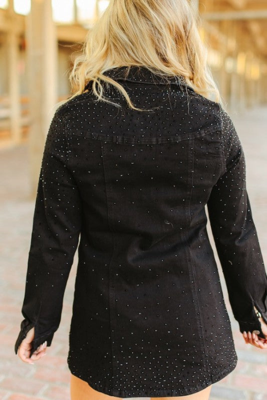 This striking Western-inspired black denim shirt / dress merges edgy attitude with refined elegance. Crafted from ultra-soft suede, it features a classic button-down silhouette enhanced by all-over rhinestone stud detailing that catches light beautifully. The collared neckline, functional front pockets, and curved hem offer versatility—wear it as a statement dress with boots or layer it as a tunic over leggings. Perfect for the modern cowgirl who refuses to compromise on style or substance, this piece transitions seamlessly from rodeo-ready to everyday Western chic.